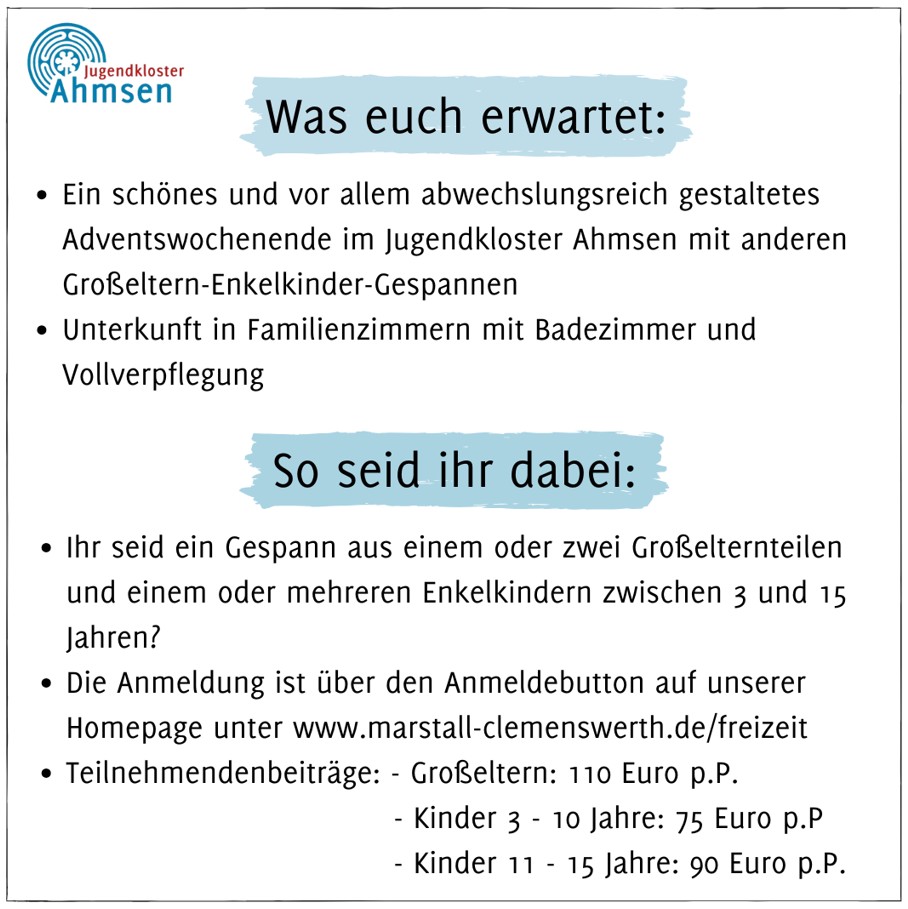 Anmeldung: über Campflow: https://on.campflow.de/marstall-clemenswerth-und-jugendkloster-ahmsen-ev/adventswochenende-mit-oma-und-opa-2-0